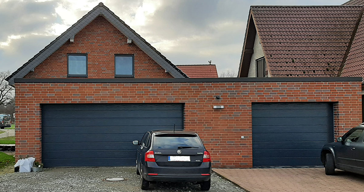 Die Dreifachgarage ist über einen Flur direkt mit dem Haus verbunden und bietet durch einen integrierten Abstellraum zusätzlich Stauraum für Fahrräder und Gartengeräte. Für die Bauherren stehen in der Garage zwei Stellplätze zur Verfügung. Der dritte Stellplatz ist baulich getrennt und kann so von den Eltern der Bauherren genutzt werden.